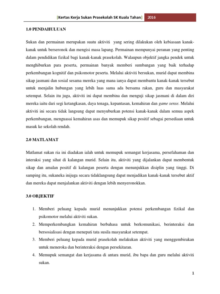 Ketua Kampung Luit 26500 MARAN. Dasar Sukan Negara merupakan dasar pembangunan sukan ke arah pembentukan budaya sukan dan pemantapan integrasi nasional menerusi penglibatan masyarakat secara menyeluruh dan pencapaian. KERTAS KERJA PROGRAM SUKAN NEGARA PERINGKAT SEKOLAH.