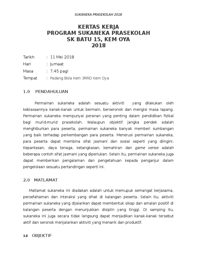 Contoh Jertas Kerja Sukan Prasekolah